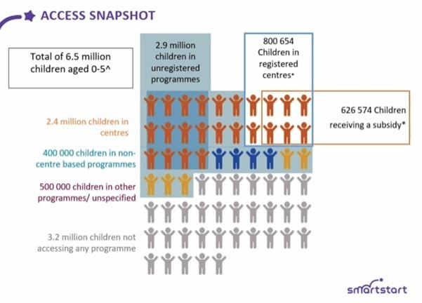 The effects of poor development in early childhood have life-long consequences, setting children on a lower trajectory and adversely impacting a country’s social and economic development. In South Africa, there has been a steady increase in the number of children aged three to five enrolled in group learning programmes, but UNICEF estimates that less than half of those attending participate in programmes of sufficient quality to derive the expected benefits from early childhood education. Furthermore, it was estimated that more than 1 million children, primarily those from the poorest backgrounds, did not have access to any form of group learning programme.